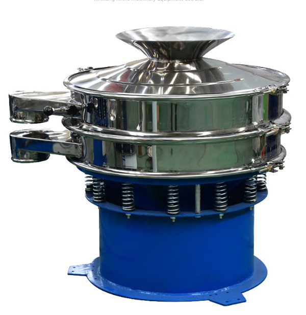 2層振動篩系三次元旋振篩,由直立式電機(jī)作激振源,電機(jī)上、下兩端安裝有偏心重錘,將電機(jī)的旋轉(zhuǎn)運(yùn)動轉(zhuǎn)變?yōu)樗?、垂直、傾斜的三次元運(yùn)動,再把這個運(yùn)動傳遞給篩面,使物料在篩面.上做外擴(kuò)漸開線運(yùn)動,故該系列振動篩稱之為旋振動篩。旋振篩具有物料運(yùn)行的軌跡長,篩面利用率高等優(yōu)點,調(diào)節(jié)上、下兩端重錘的相位角,可改變物料在篩面上的運(yùn)動軌跡.可以對物料進(jìn)行精篩分、概率篩分等。